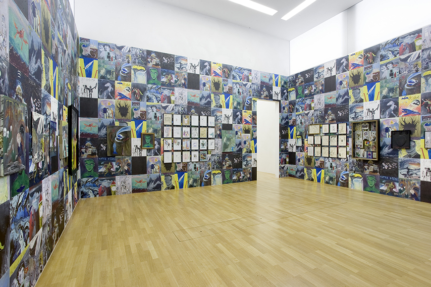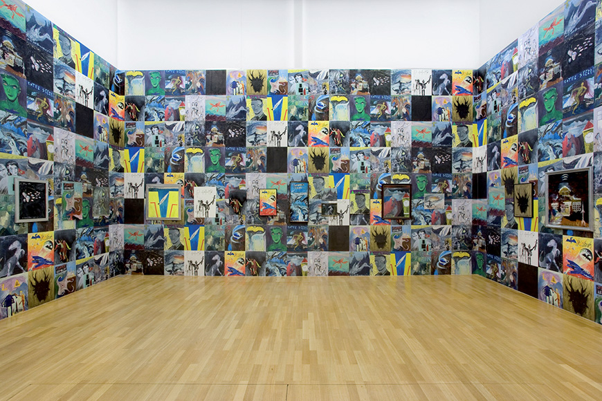 Achtung: das jpg war mit Strange Stars betitelt, laut Katalog Goetz (S. 182) und der Installationsansicht müsste es aber diese Arbeit sein29.5 × 22.7 2002This is Andy Hope SpeakingInk on paperboard26.7 × 18.5 2004Prisoners of Doctor DoomInk on paper29.5 × 18.6 DeathInk on paper29.5 × 22.5 2004Forever PeopleInk on paper29.5 × 20.6 2006NeedleInk, collage on paper29.5 × 22.5 2004Ghost RiderCollage, color copy, pencil on paper18 × 13 2004Batman GalleryCardboard, wood, lacquer, 9 drawings289 × 172 × 515 2005PlutonMetal, glass, felt pen28 × 5 2005When Dinosaurs Become ModernistsPlexiglass-plinth, plastic-bowl, 6 plastic-figures and felt pen122 × 61 × 41 2004Before this time exist I was this time23 parts 2004Tell I’m on vacationPencil on paper29.5 × 23 2002Sun is shiningPencil, colored pen on paper29.5 × 20 2006Ohne Titel (Superman in Davos)Collage, colored pen, watercolor on paper29.5 × 22 2006Falling from sky29 × 23 2004Stay behind this linesFelt pen on paper29.5 × 20.5 2006Holy family and reconstruction historyFelt pen on paper29 × 20.5 2004Zurück nach Afrika mit uns allenColored pen on paper29.5 × 19 2004FOREVER PEOPLEFelt pen on paper29.5 × 19 2004Ohne Titel (Totenkopf mit Rakete)Felt pen on paper29.5 × 19 2001before this time exist I was this timeFelt pen, colored pen on paper29.5 × 21 2004INFERIAFelt pen, colored pen on paper29.5 × 18.5 2004DEAD JESUSCollage, felt pen, ball pen, colored pen on paper29.5 × 21 2004imaginary with Jack KirbyCollage, felt pen on paper29.5 × 21 2004from Family backFelt pen on color copy29.5 × 20.8 2004COSMO IL PLANETOFelt pen on color copy29.5 × 18.8 2004The world seems to stand still tremblingFelt pen on color copy19 × 19 2004Ohne Titel (Kreuz mit Ungeheuer)Collage, pencil on paper29.5 × 21 2004KINGDOME COMEFelt pen on paper21 × 14.6 2004LORDS OF HARVESTFelt pen on paper29.5 × 19 2004We look forwardFelt pen on paper29.5 × 18 2004Remember the AlamoFelt pen on paper29.3 × 20.8 2004We roll in goldCollage, pencil, felt pen on paper29 × 18.8 2004Attacke der WölfeCollage, felt on paper29 × 20.5 2005TERRORS OF THE DEVIL SUNOil on paperboard65 × 30 2005SolarOil on paperboard44 × 75 2005RED WORLDOil on paperboard49 × 41 2005UraniaOil on board46 × 36 2005Galassia che vaiOil on canvas80 × 58 2005DEATHWORLDOil on cardboard60.7 × 50.4 2006The Planet of PerilGouache on cardboard54.9 × 47.6 2005Forbidden WorldsOil on mirror78 × 37 2005The UnexpectedOil on cardboard70 × 70 2005Jupiter VCollage made of oil, paper, wool 76.8 × 63.9 2005Time BannersOil on canvas69 × 58.8 2005Devil SunInk on paper56.6 × 45.7 2005Non WorldInk on paper29 × 20Tags: Data Incomplete 2005The Green ShowCollage, color copy, pencil on cardboard18.5 × 13.5Tags: Data Incomplete 2004OLD BEGINNINGCollage, color copy, pencil on paperboard24.5 × 17.5Tags: Data Incomplete 2006War WyversAcrylic, enamel, gold bronze on wood 125 × 251 2005UnaOil on wood 59.8 × 49.7 2006Reich (Empire)Fiberglass, epoxy, steel, enamel and acrylic