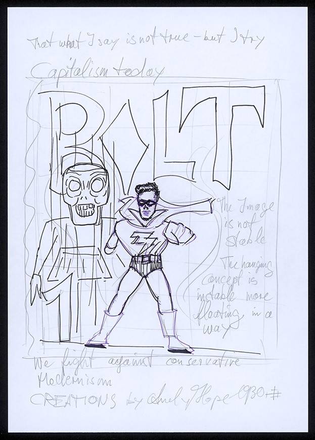 34 × 23.5 cm Ink on paperDrawingSeries: WPTags: Totalitarianism/fascist aestheticsWelt ohne EndeThe Long TomorrowSolo Presentation, Maschenmode (Galerie Guido W. Baudach)Painting on the Roof - 2002California Art Show