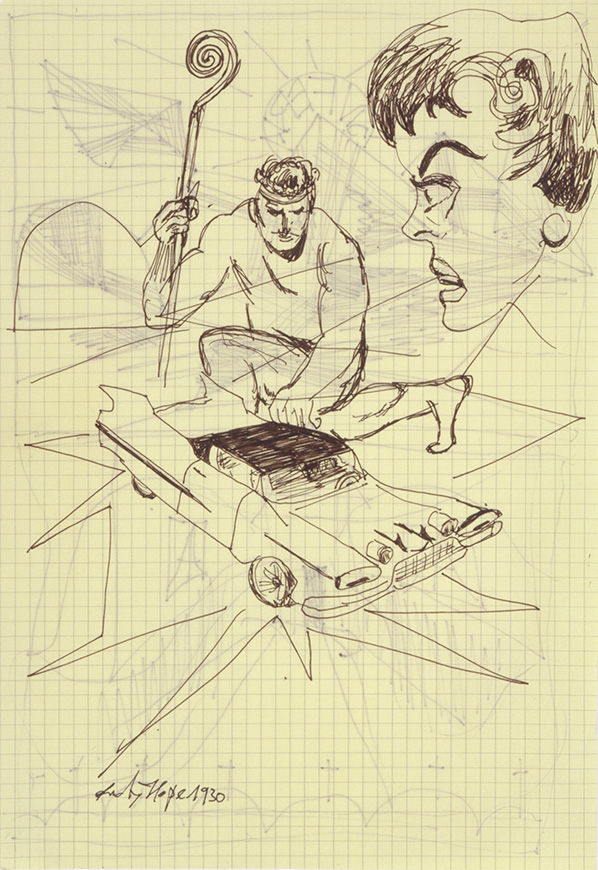29.7 × 21 cm Marker pen on paperDrawingThis Island EarthFruits de la PassionHOFEA33892 - 1996Untitled (Man with crook, Joan Crawford and car)