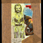 29.7 × 21 cm Collage, adhesive tape, ball pen on paperDrawingHinter den HügelnSolo Presentation, Maschenmode (Galerie Guido W. Baudach)Man Son 1969. Vom Schrecken der Situation - 2001Traum eines Cyborgs I