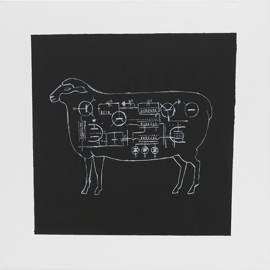 100 × 100 cm Acrylic on canvasPaintingSeries: A Square's DreamTags: Machine, SheepWhere Did it Come From!Busan Biennale 2018: Divided We Stand