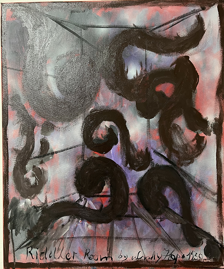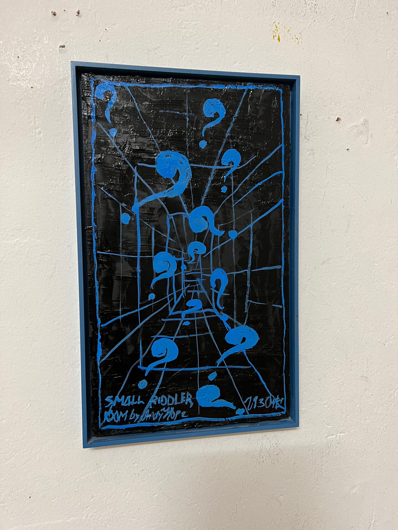 Framed Oil on spray paintPaintingSeries: RiddlerDelirious Escape - 2021Small Riddler Room