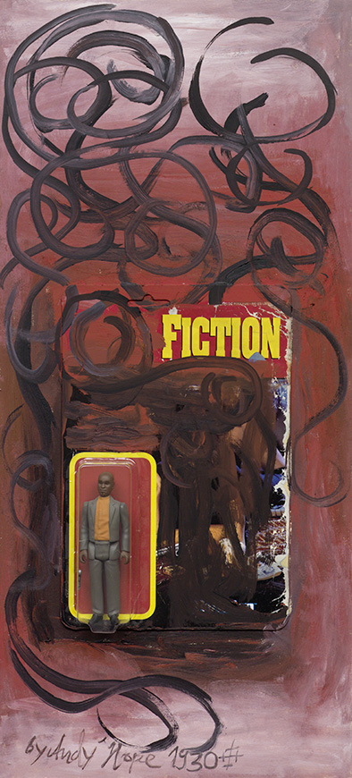 64 × 39.5 × 4.5 cm Acrylic, acrylic spray on board, action figure in plastic wrapping ObjectSebastian Hammwöhner, Andy Hope 1930, Gareth Nyandoro - 2015Fiction