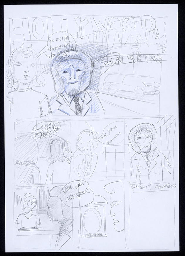 Ballpoint pen and hightlighter on paper DrawingSeries: Fran AthensTags: Storyboard - Hollywood
