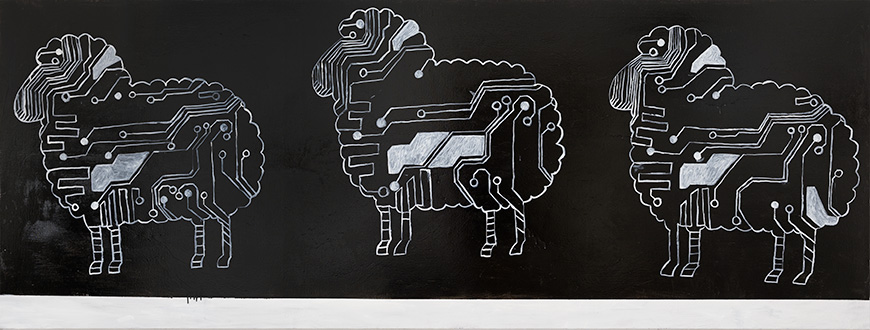 110 × 290 cm Lacquer, acrylic on canvasPaintingSeries: A Square's DreamTags: Machine, Sheep - 2021A Square’s Dream I