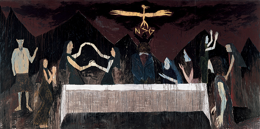 300 × 210 cm Acrylic, lacquer on cottonPaintingSeries: NeverworldTags: Dinosaur - 2004New Gods