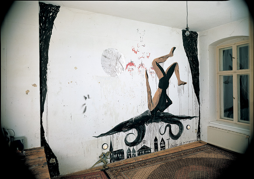 300 × 600 cm Acrylic, lacquer on woodPaintingWelt ohne Ende - 2004When a man falls from the moon and becomes a strange cross